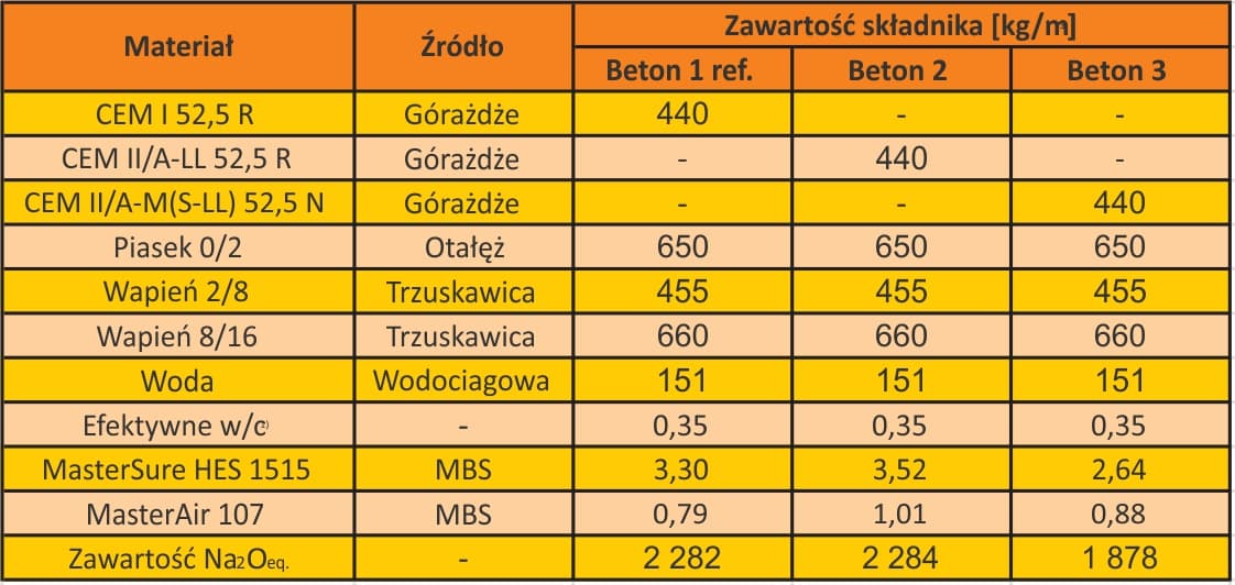 Zawartość alkaliów aktywnych Na2Oeq w betonach z cementami CEM II/A-M (S-LL) 52,5N i CEM II/A-LL 52,5R nie przekroczyła 2,4 kg/m3 pomimo wysokiej zawartości tych cementów w składzie betonu i była porównywalna z betonem z cementu CEM I 52,5R. Spełniając równocześnie wymagania WWiORB GDDKiA [2] dla betonu stosowanego w obiektach najwyższej klasy S4 oraz najwyższej kategorii oddziaływania środowiska E3 w kontekście zapobiegania reakcji alkalia-reaktywne kruszywo. Dopuszczalne ugięcia belek wykonanych podczas próby przemysłowej z betonu zawierającego cement portlandzki wapienny CEM II/A-LL 52,5R mieściły się w dopuszczalnych granicach normowych oraz były na poziomie belek wykonanych z cementu portlandzkiego CEM I 52,5R, co pokazuje, że cementy portlandzkie wieloskładnikowe CEM II/A mogą być z powodzeniem stosowane jako składnik betonu do produkcji elementów sprężonych.