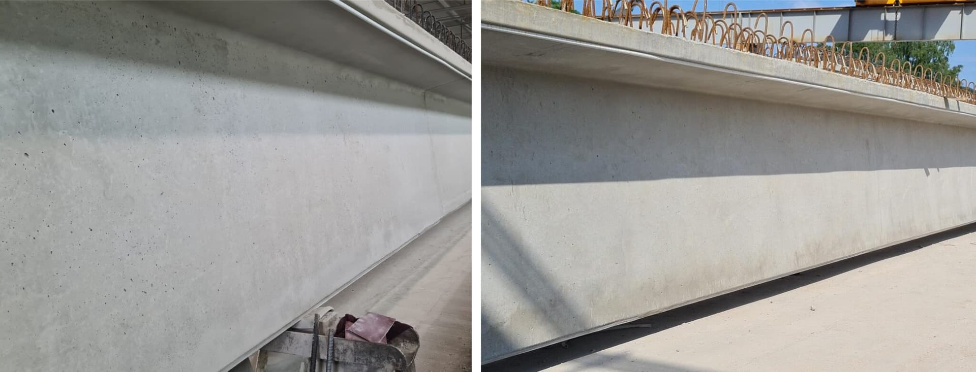 W pierwszym etapie jeden z torów został zabudowany mieszanką betonową wyprodukowaną z cementu portlandzkiego CEM I 52,5R. Po 16 godzinach dojrzewania, w tym 6 godzin stanowiła obróbka cieplna w temperaturze 40°C, uzyskano wytrzymałość na ściskanie 42,7 MPa. Po zwolnieniu naciągów uzyskano przeciw-strzałkę w zakresie od 18 mm do 20 mm, a po 14 dniach ponowny pomiar strzałek wykazał wartości od 25 mm do 29 mm. W drugim etapie w produkcji belek zastosowano mieszankę betonową wyprodukowaną z cementu portlandzkiego wapiennego CEM II/A-LL 52,5R. Po tym samym czasie dojrzewania i po 6 godzinnej obróbce cieplnej w temperaturze 40°C uzyskano wytrzymałość na ściskanie 41,1 MPa. Natomiast po zwolnieniu naciągów uzyskano przeciw-strzałkę w zakresie 19 mm do 21 mm, a po 14 dniach składowania wartość przeciw-strzałek mieściła się od 26 mm do 28 mm. W obu przypadkach zostały spełnione założenia projektowe, gdzie maksymalne dopuszczalne ugięcie belek po sprężeniu wynosi 46 mm. Zaleca się, aby belki były zamontowane i obciążone w miejscu docelowym nie wcześniej niż po 30 dniach od wyprodukowania oraz nie później niż 180 dni.