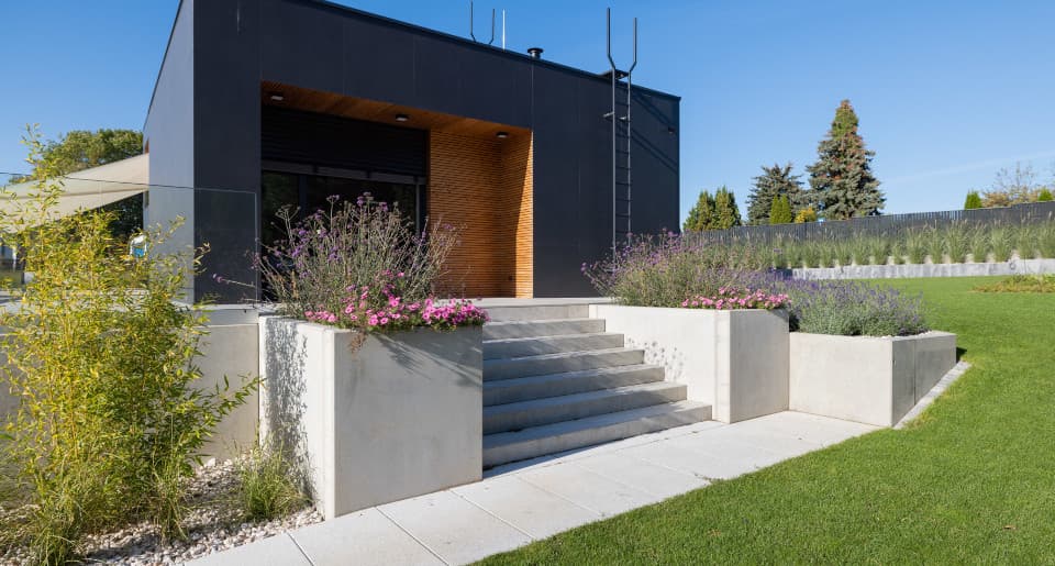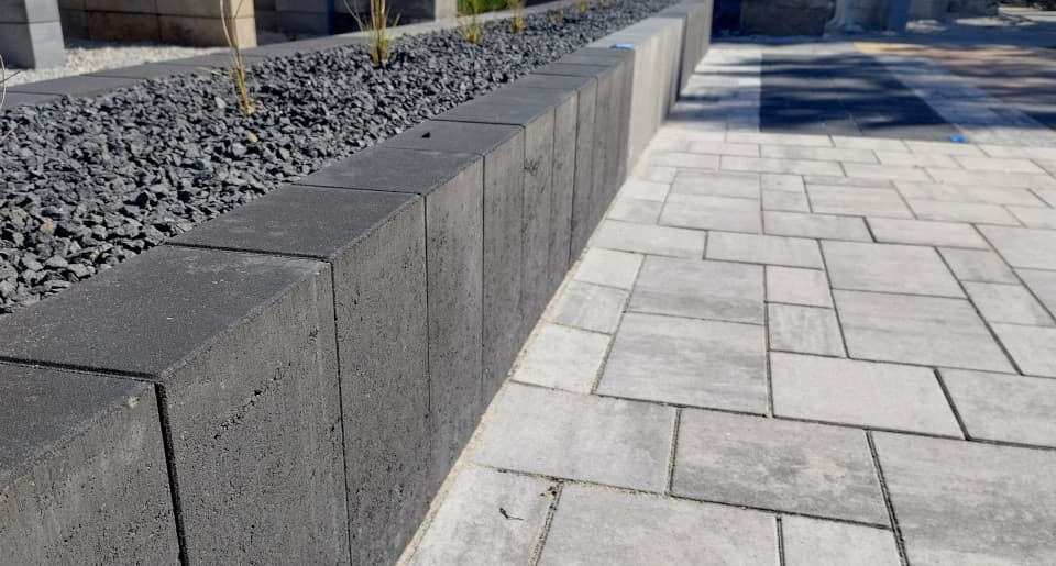- Niższe elementy (np. 40x18x12 cm) – mogą stanowić efektowną alternatywę dla obrzeży wzdłuż ciągów komunikacyjnych. To także dobry sposób na atrakcyjne wydzielenie i zabezpieczenie strefy zieleni czy budowę rabat kwiatowych