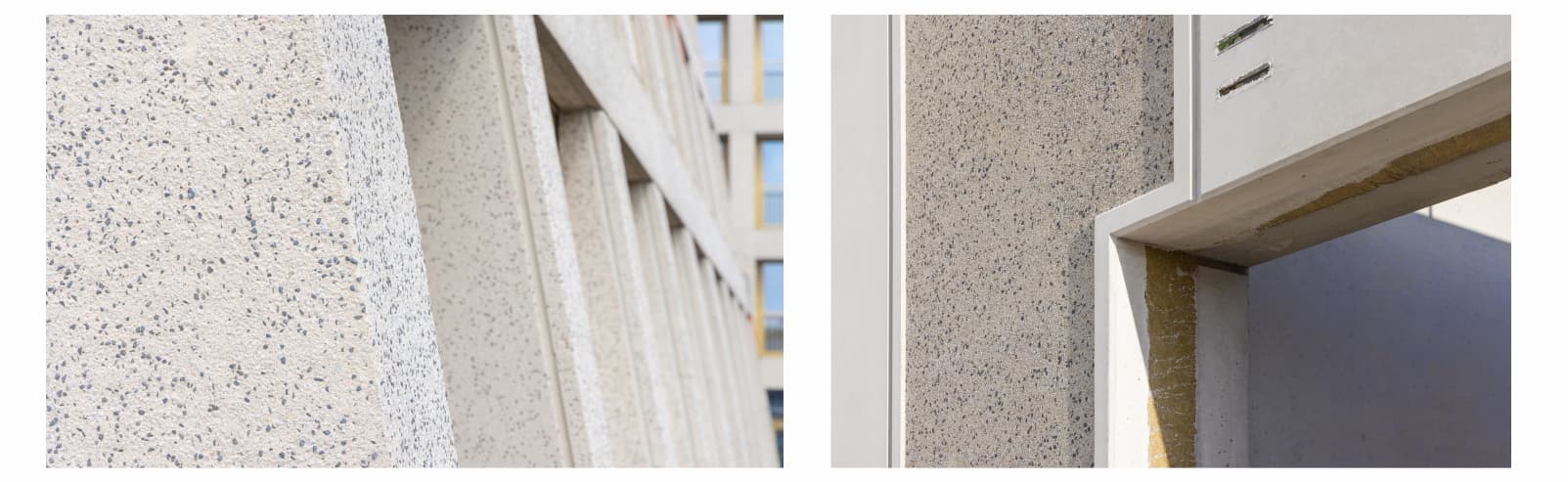 Piaskowanie pozwala na wydobycie struktury betonu na całej powierzchni lub wybranych fragmentach elementów prefabrykowanych, podkreślając jego matowość i naturalny skład (fotografia 1). Efekt ten uzyskujemy przez skierowanie na element strumienia sprężonego powietrza z odpowiednim ścierniwem (piaskiem). Druga popularna technologia polega na wypłukiwaniu cementu i piasku z wierzchniej warstwy betonu w celu odsłonięcia zawartego w nim kruszywa. Proces płukania możliwy jest dzięki zastosowaniu opóźniacza wiązania cementu oraz dużego ciśnienia. Chcąc uzyskać właściwy efekt w płukanej warstwie elementu, wzbogaca się ją uprzednio dodatkiem wybranego kruszywa (często szlachetnego lub półszlachetnego) o odpowiedniej frakcji oraz kolorze (fotografia 2).