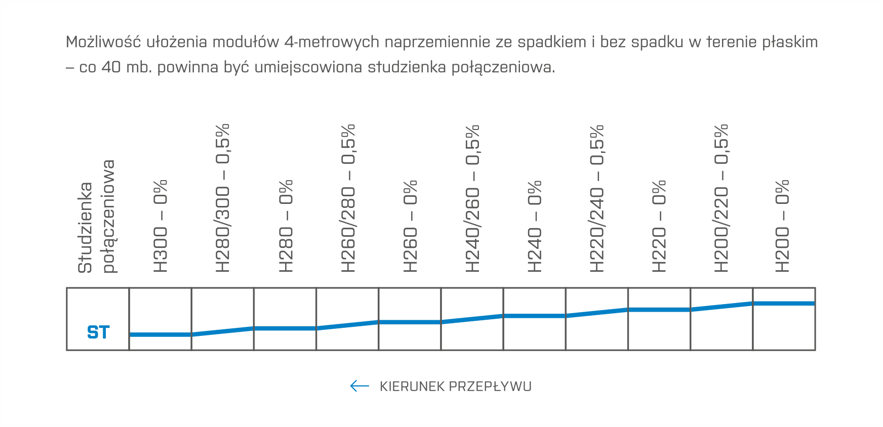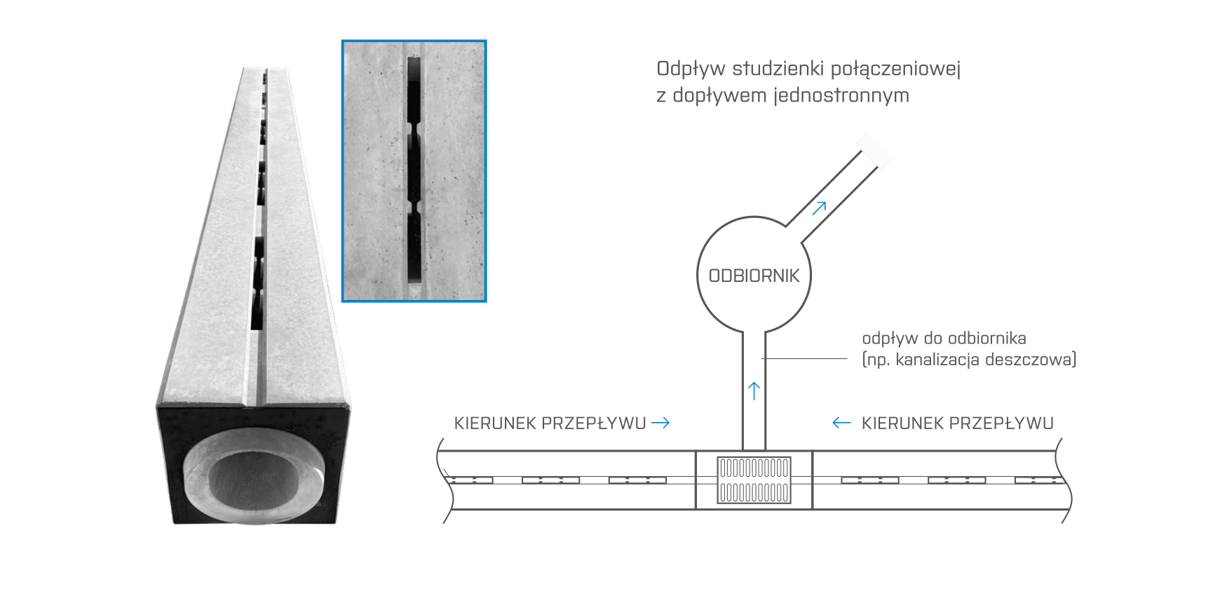 Prefabrykowane betonowe odwodnienia liniowe to kompletny system kanałów modułowych łączonych w technologii pióro-wpust z uszczelnieniem. Rozwiązanie dostępne jest w wersjach od H200 do H300, z opcją elementów przejściowych oraz różnymi wariantami spadku (spadek 0,5%, bezspadkowe). Długość pojedynczego modułu dla kanału prostego wynosi 4,0 m. Górna powierzchnia modułów została zaprojektowana ze spadkiem w kierunku korytka odwadniającego, wyposażonego w otwory o wysokiej wydajności. Całość gwarantuje trwałość, szczelność i skuteczne odprowadzanie wód opadowych z dużych powierzchni.